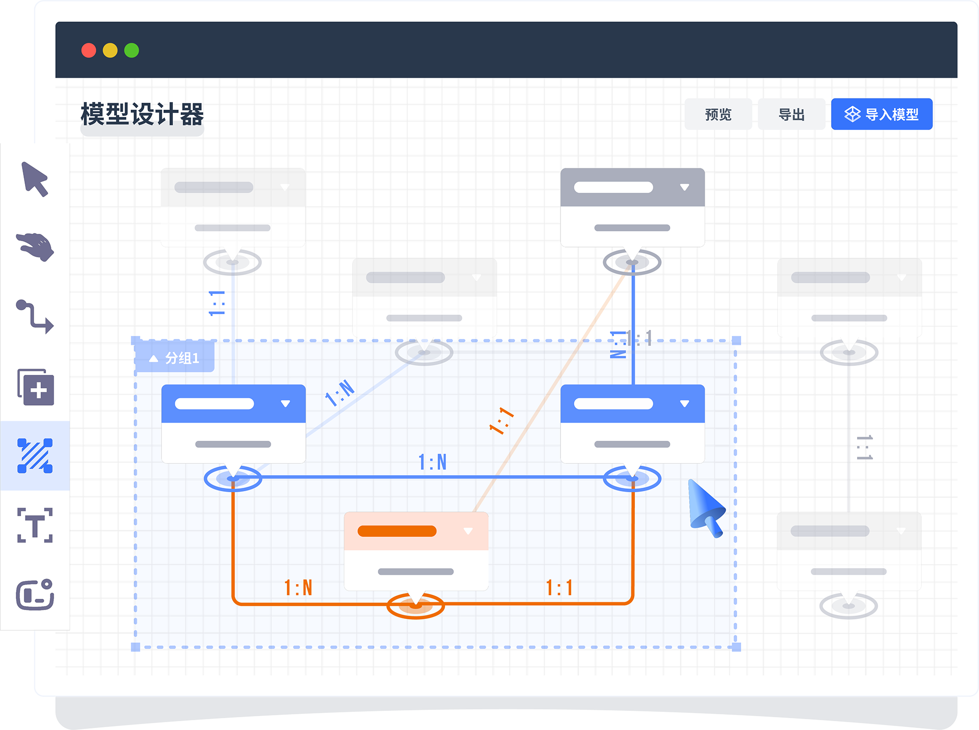 基于用戶故事設計業務模型,,,采用圖形化方式完成er圖設計,,,支持多層分組,,,面向復雜模型也可以條理清晰,,,模型支持預覽、、、導入、、、導出。