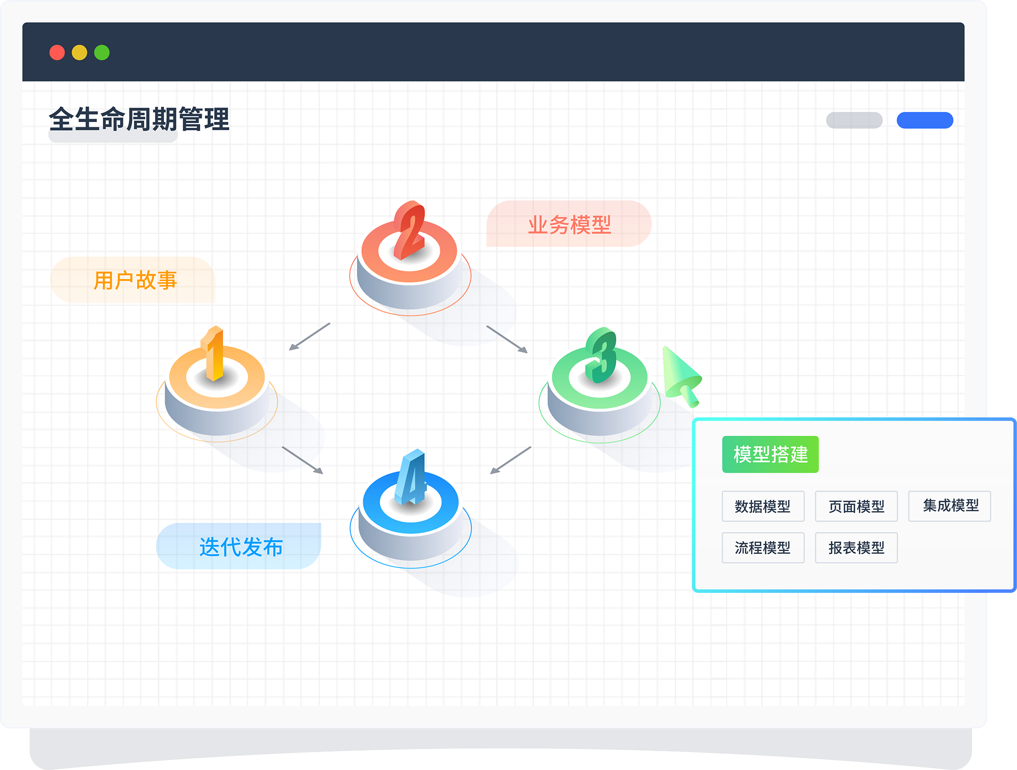 圍繞產品的用戶故事——模型設計/迭代——模型搭建——模型發布,,,進行系統的全生命周期閉環管理。