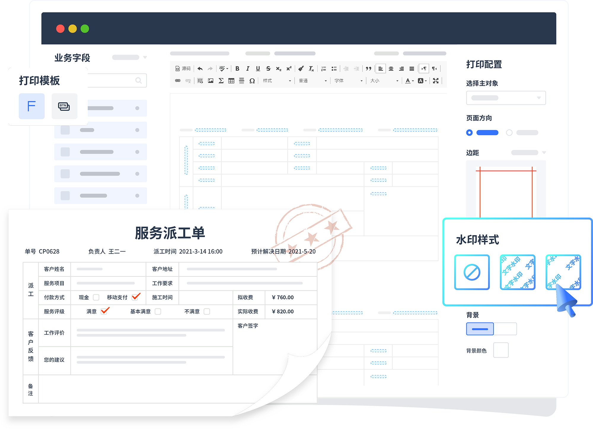 業務場景所需的打印/輸出文檔也支持自定義,,,關聯系統內數據支持水印等輔助配置。